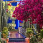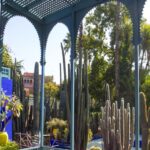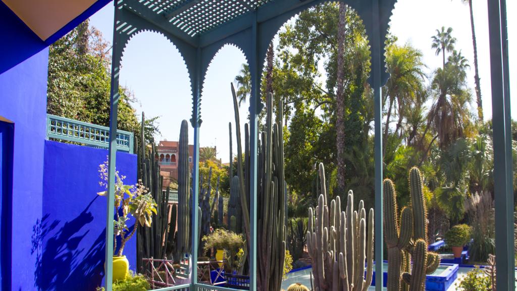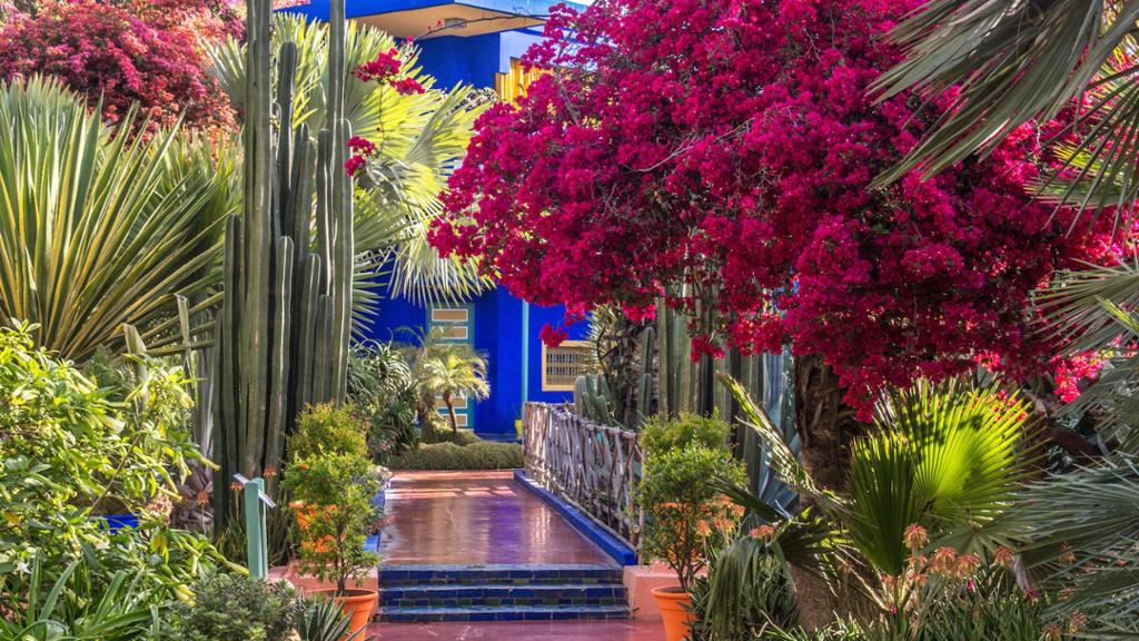 Empiece el día visitando los jardines de Majorelle, un oasis verde repleto de fuentes, estanques, bosque de bambú, cactus y una colección bellísima de museos. Además, en el jardín habitan más de 15 especies de aves norteafricanas. Déjese cautivar por los brillantes edificios de color azul que salpican este tesoro diseñado por el artista francés Louis Majorelle y restaurado posteriormente por Yves Saint Laurent.
